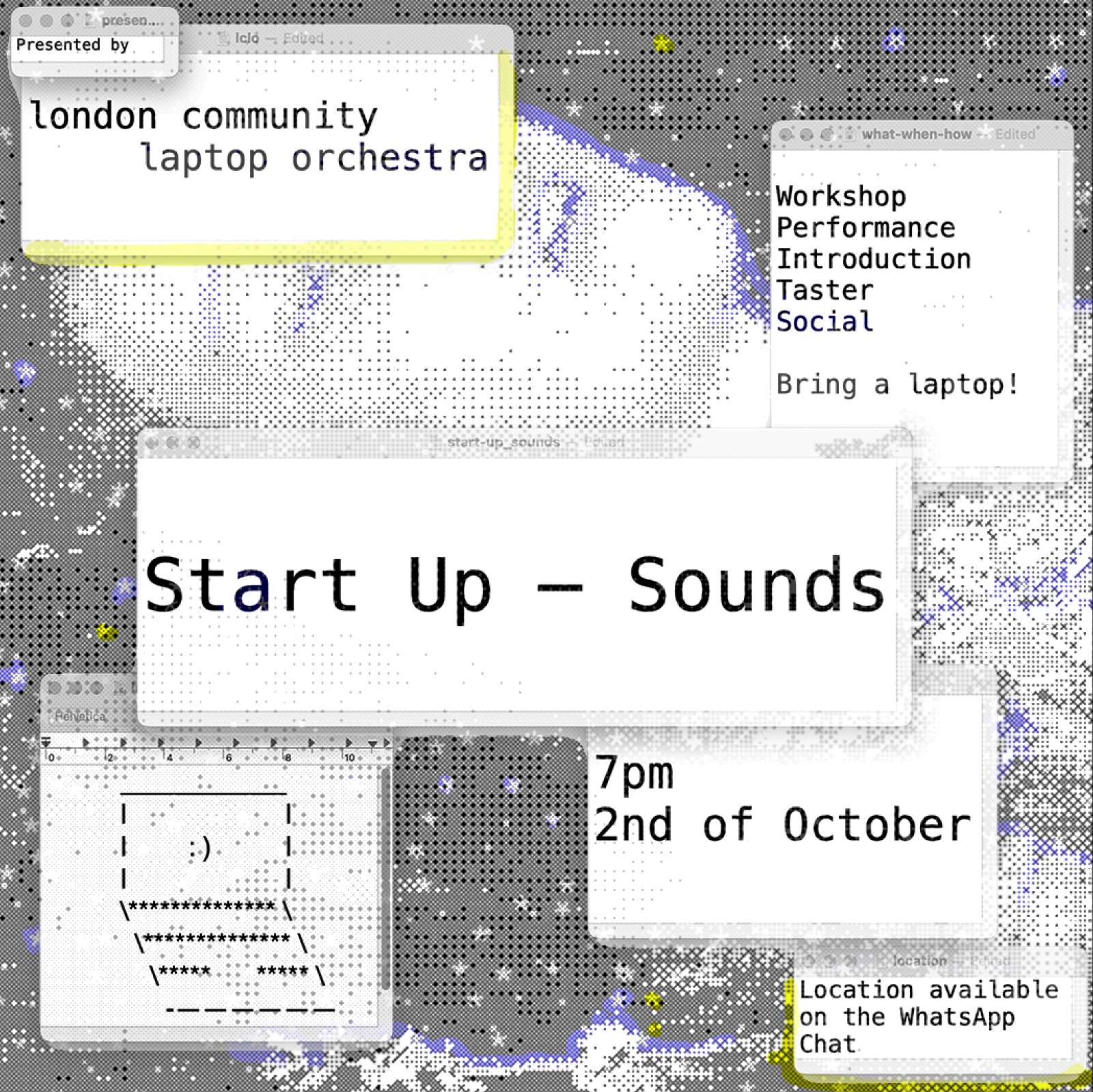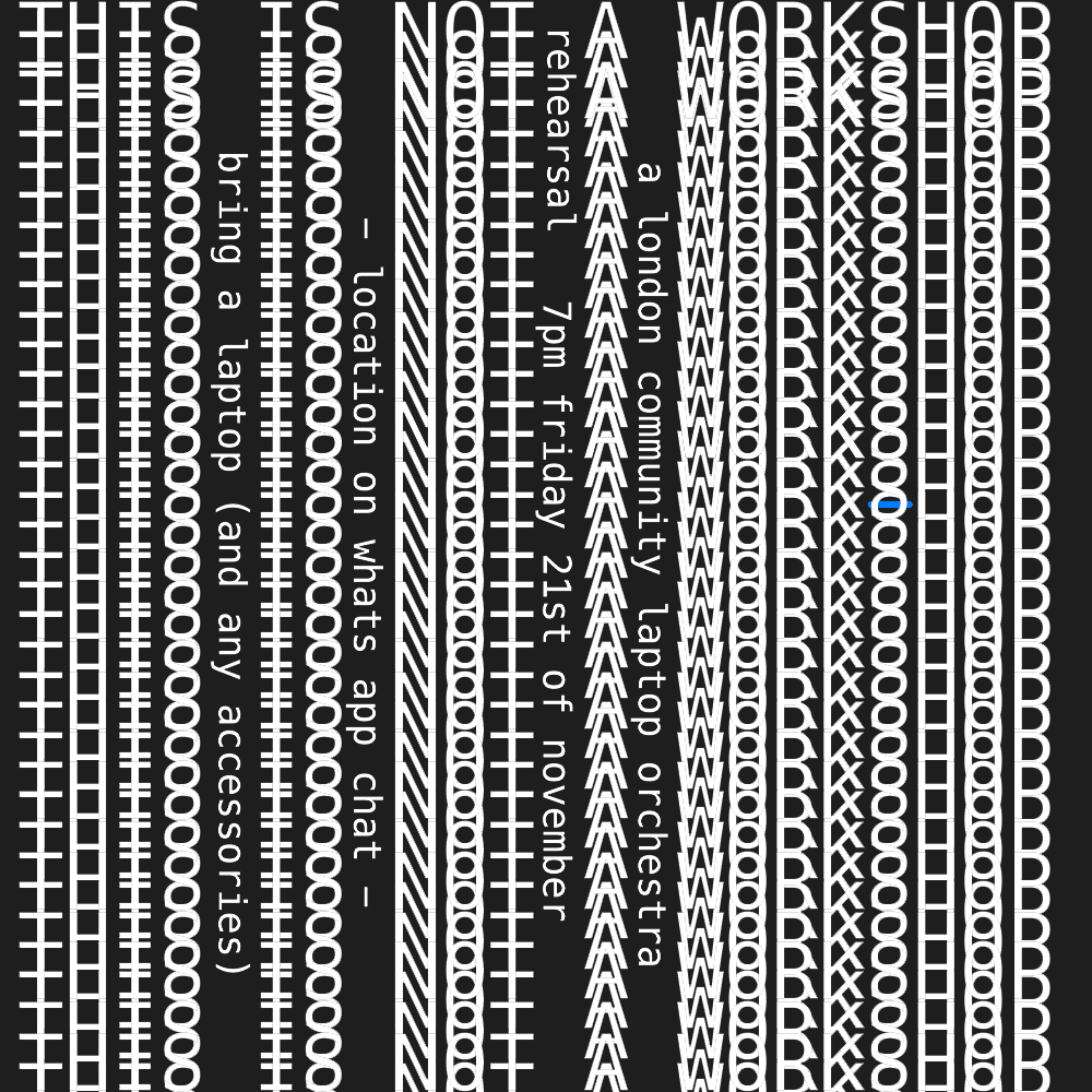 WE ARE A COMMUNITY BASED LAPTOP ORCHESTRA, OPEN TO ANYONE WHO'S INTERESTED. NO EXPERIENCE REQUIRED. ONLY A LAPTOP.